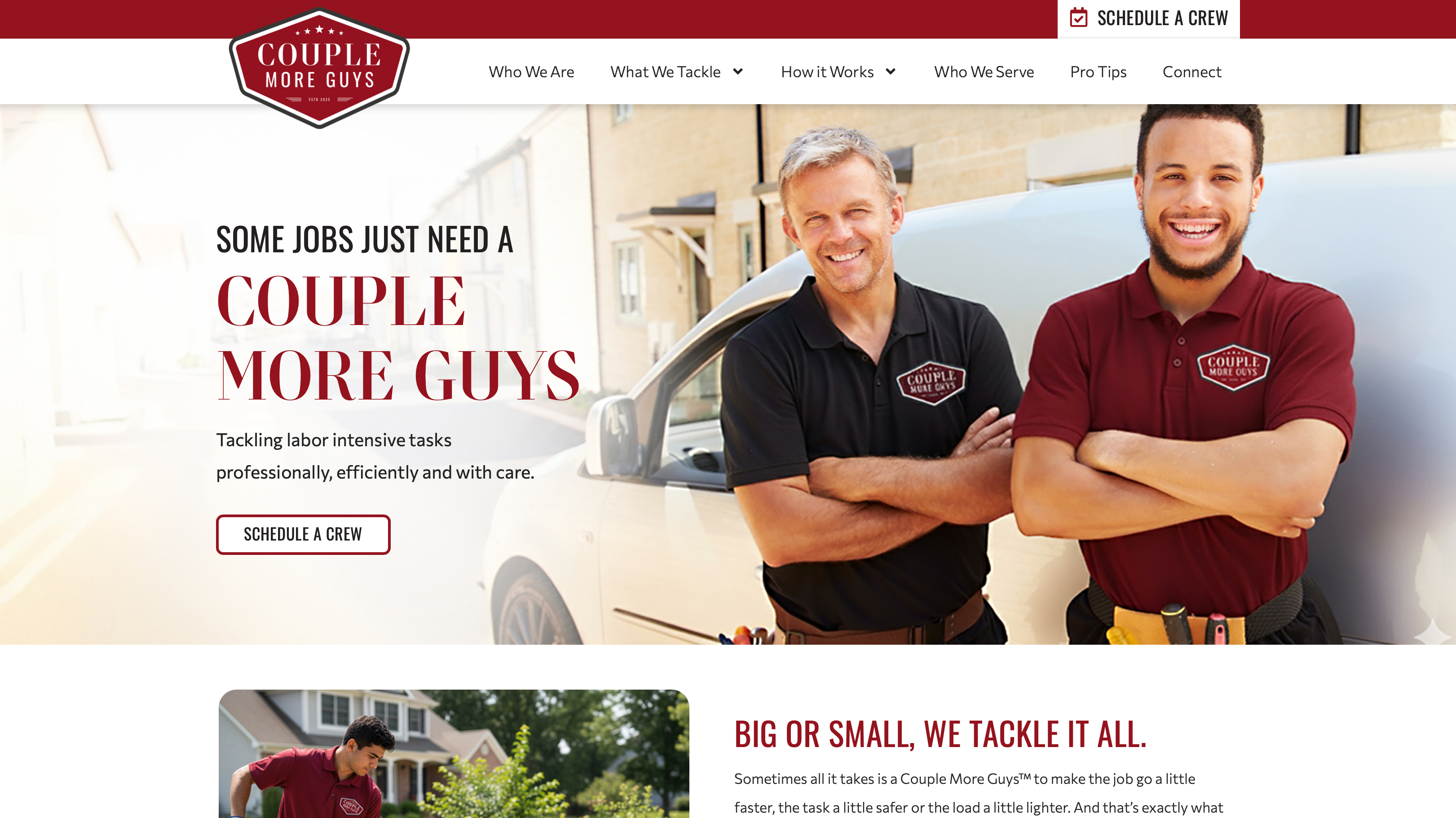 Branding & Website Build for Couple More Guys™ Couple More Guys™ is a new Lake Country–based service brand founded by Matt and Julie Gerber, offering an on-demand two-person crew for moving assistance, hauling, heavy lifting, event setup, yard projects, and a wide range of small-to-medium tasks that require “a couple more